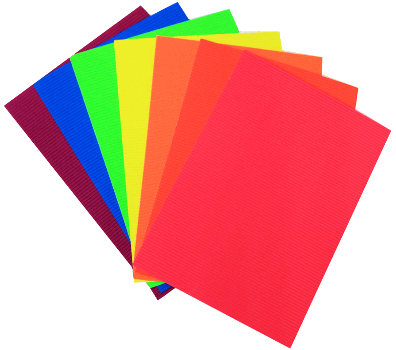 Cartón corrugado en colores intensos, de alta resistencia y calibre. Es ideal para uso escolar, como también para decoraciones y manualidades.